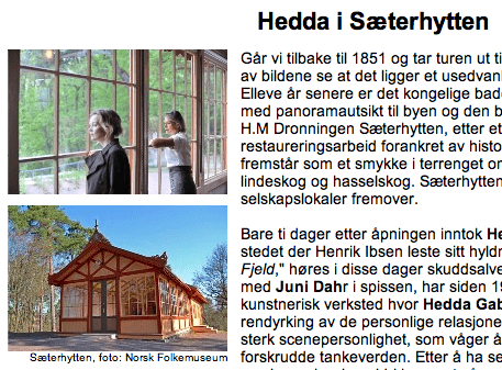 Hedda Gabler spilles på Sæterhytten 12. mai-17. juni. Billetter for juni legges ut 30. april. Billettsalg gjennom Billettservice. Sæterhytten er et lite hus på Bygdøy: Det ligger på Dronningberget, kollen innerst i Frognerkilen, nær Bygdøylokket. Parkering enten i Bygdøyveien, ved Rhodeløkken kafé eller på tunet ved driftsbygingen til Bygdø Kongsgård. Sæterhytten ligger en kort spasertur på fin skogssti fra parkeringsmulighetene. …