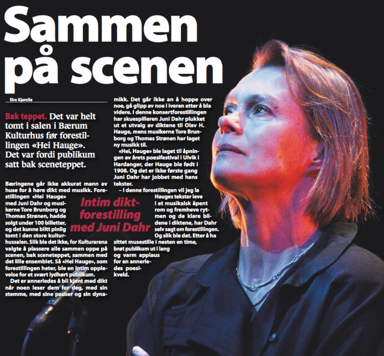 Bak teppet. Det var helt tomt i salen i Bærum Kulturhus før forestillingen «Hei Hauge». Det var fordi publikum satt bak sceneteppet. Bæringene går ikke akkurat mann av huse for å høre dikt med musikk. Forestillingen «Hei Hauge» med Juni Dahr og musikerne Tore brunborg og Thomas Strønen, hadde solgt under 100 billetter, og det kunne blitt pinlig tomt i den store kulturhussalen. Slik…
